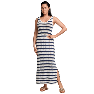 Abito lungo effetto uncinetto traforato a righe orizzontali.