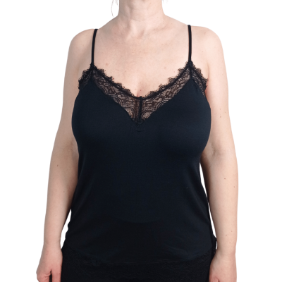 Spalla stretta regolabile e scollo a V decorato con pizzo.
